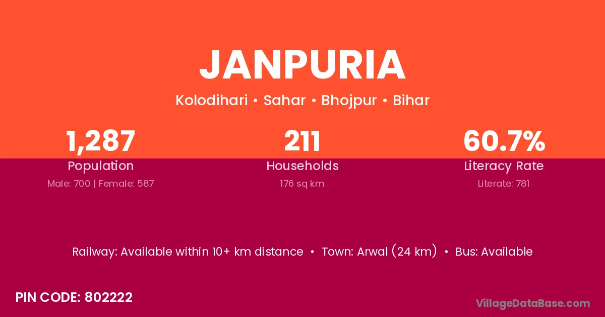 Arwal (24 km) is the nearest town to Janpuria village for major economic activities and is located approximately 24 km away.