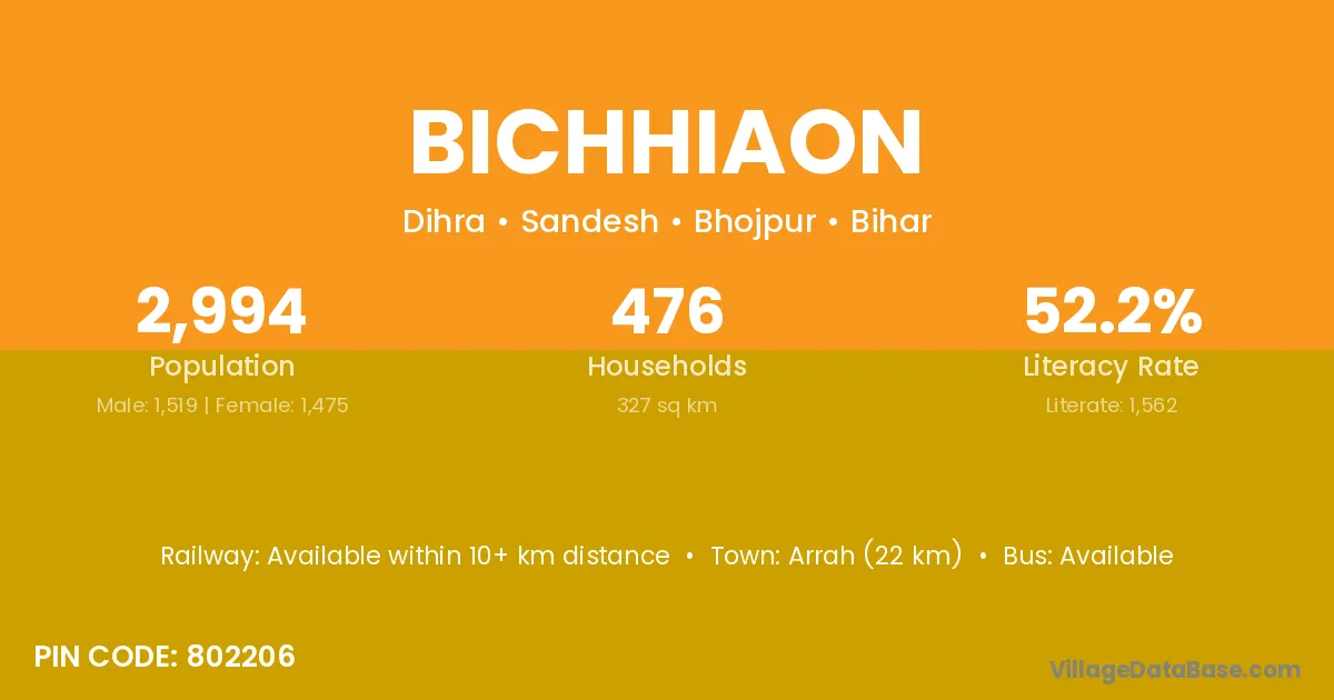 Arrah (22 km) is the nearest town to Bichhiaon village for major economic activities and is located approximately 22 km away.