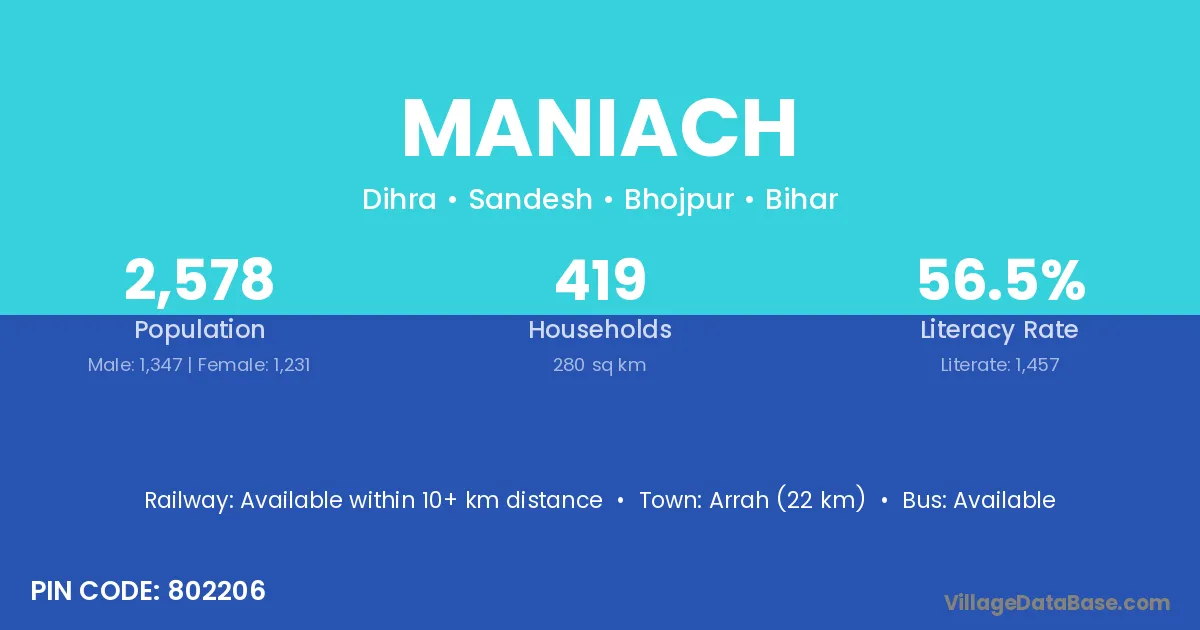 Arrah (22 km) is the nearest town to Maniach village for major economic activities and is located approximately 22 km away.