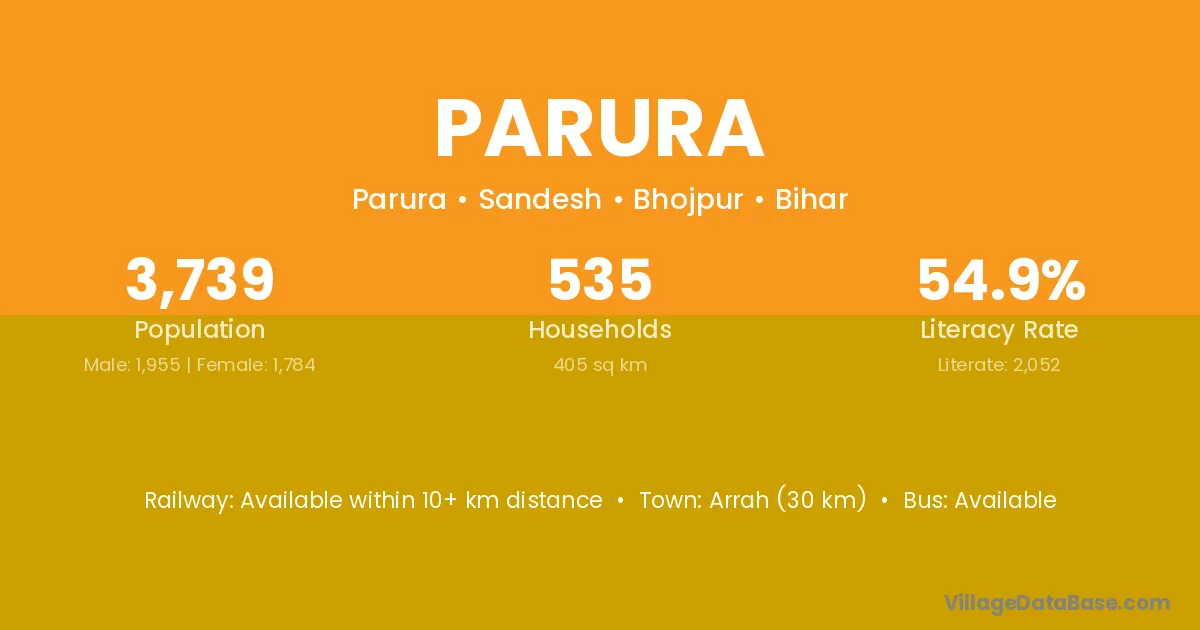 Arrah (30 km) is the nearest town to Parura village for major economic activities and is located approximately 30 km away.