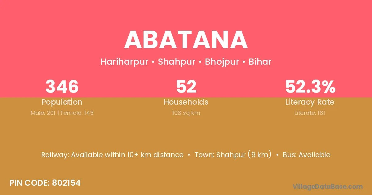 Abatana village has a total population of 346 people, of which 201 are males and 145 are females.