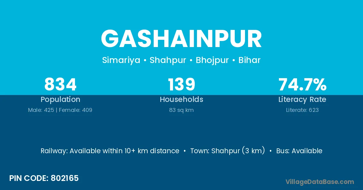 Shahpur (3 km) is the nearest town to Gashainpur village for major economic activities and is located approximately 3 km away.