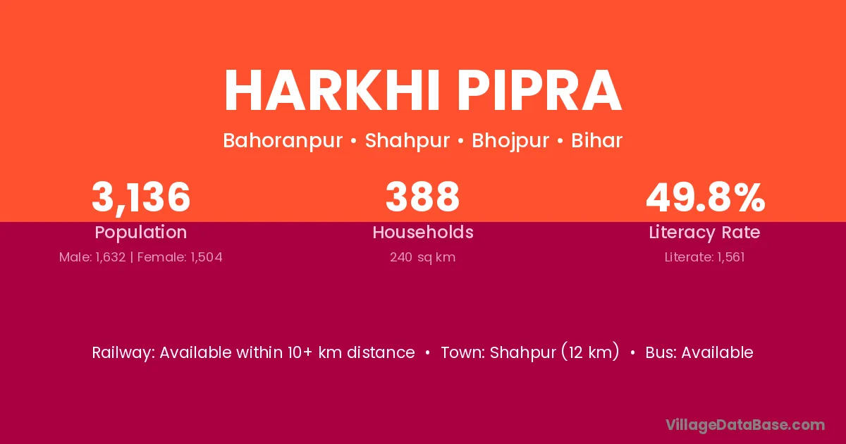 Harkhi Pipra village has a total population of 3,136 people, of which 1,632 are males and 1,504 are females.