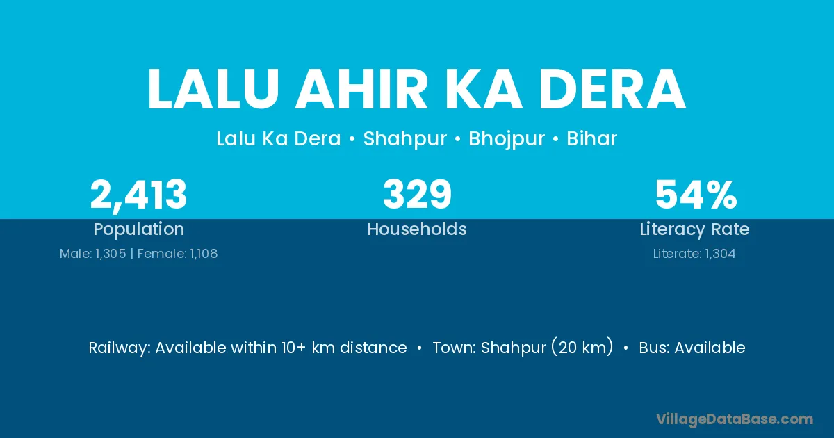 Lalu Ahir Ka Dera village has a total population of 2,413 people, of which 1,305 are males and 1,108 are females.