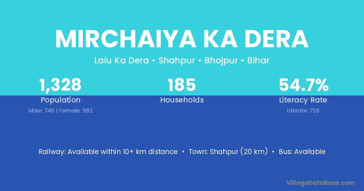 Mirchaiya Ka Dera village has a total population of 1,328 people, of which 746 are males and 582 are females.