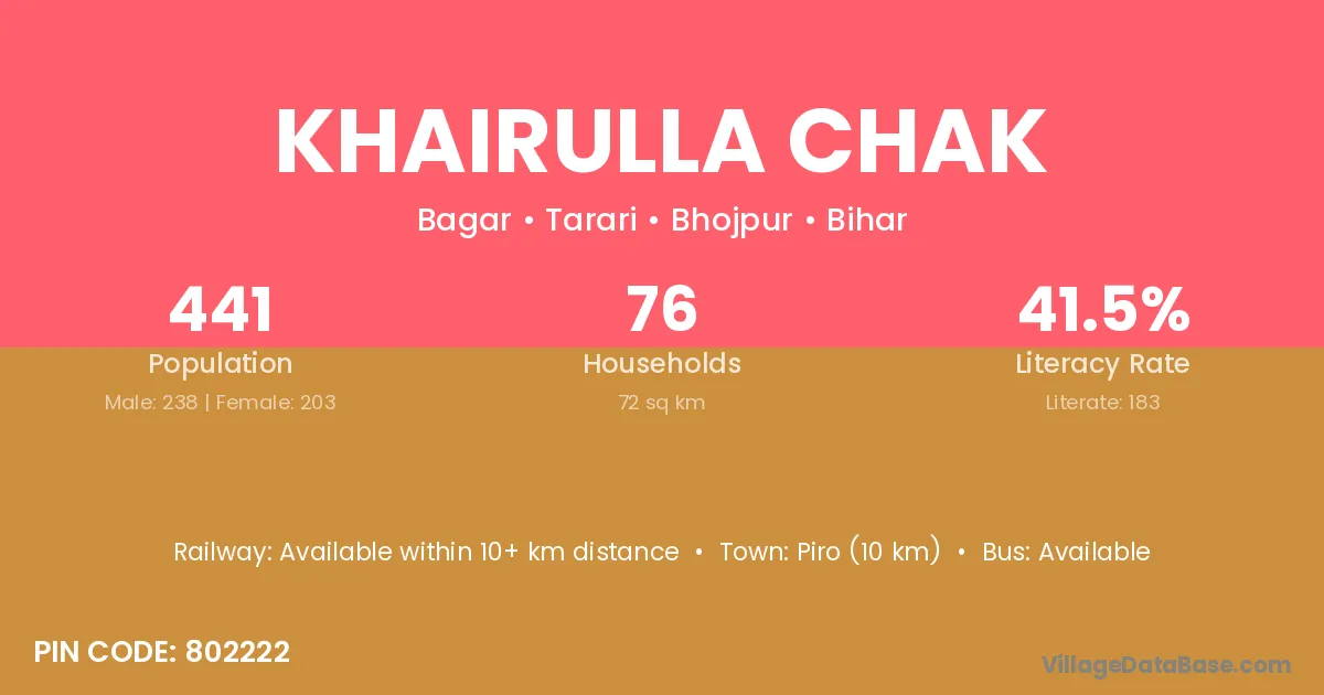 Piro (10 km) is the nearest town to Khairulla Chak village for major economic activities and is located approximately 10 km away.
