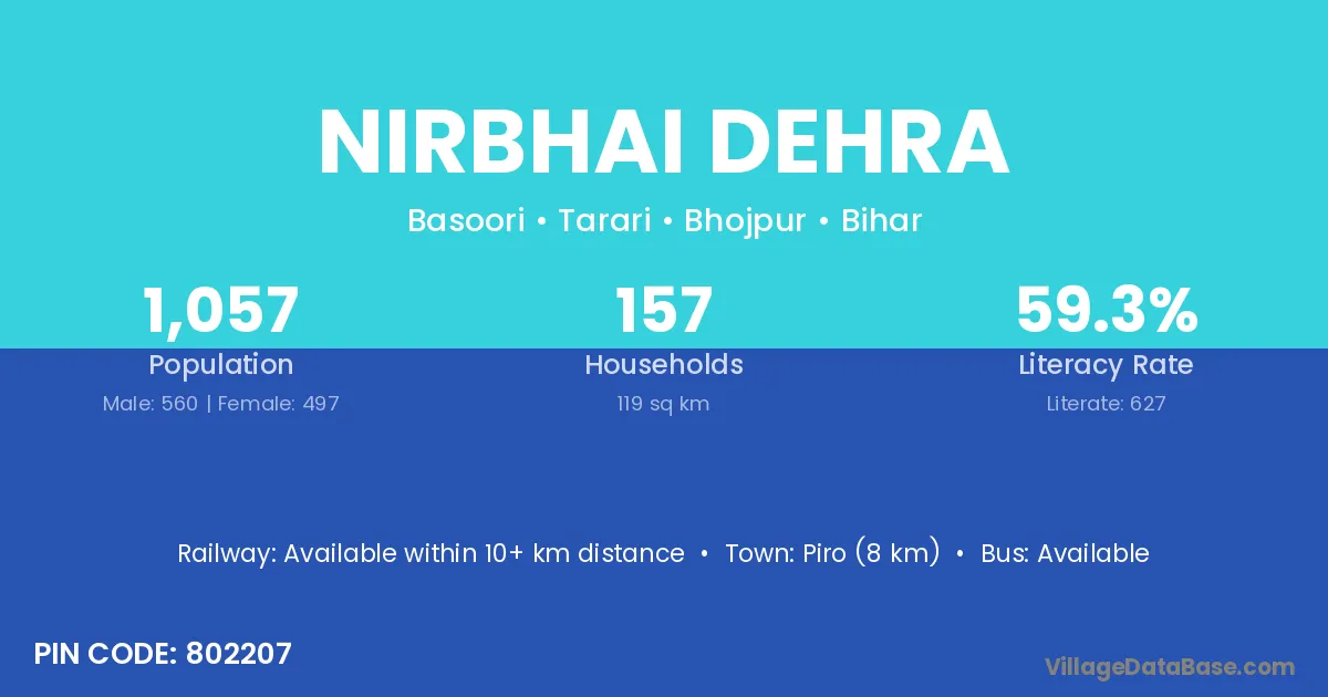 Piro (8 km) is the nearest town to Nirbhai Dehra village for major economic activities and is located approximately 8 km away.