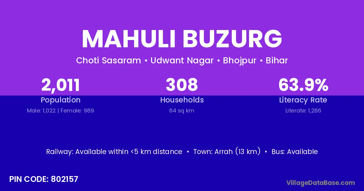 Arrah (13 km) is the nearest town to Mahuli Buzurg village for major economic activities and is located approximately 13 km away.