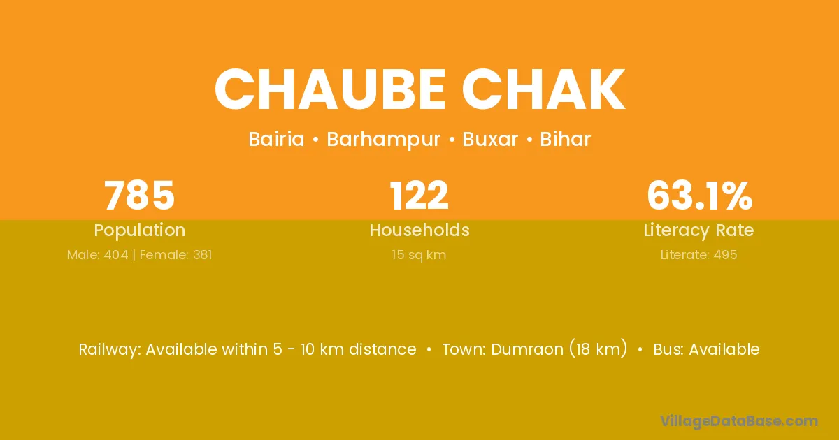 Dumraon (18 km) is the nearest town to Chaube Chak village for major economic activities and is located approximately 18 km away.