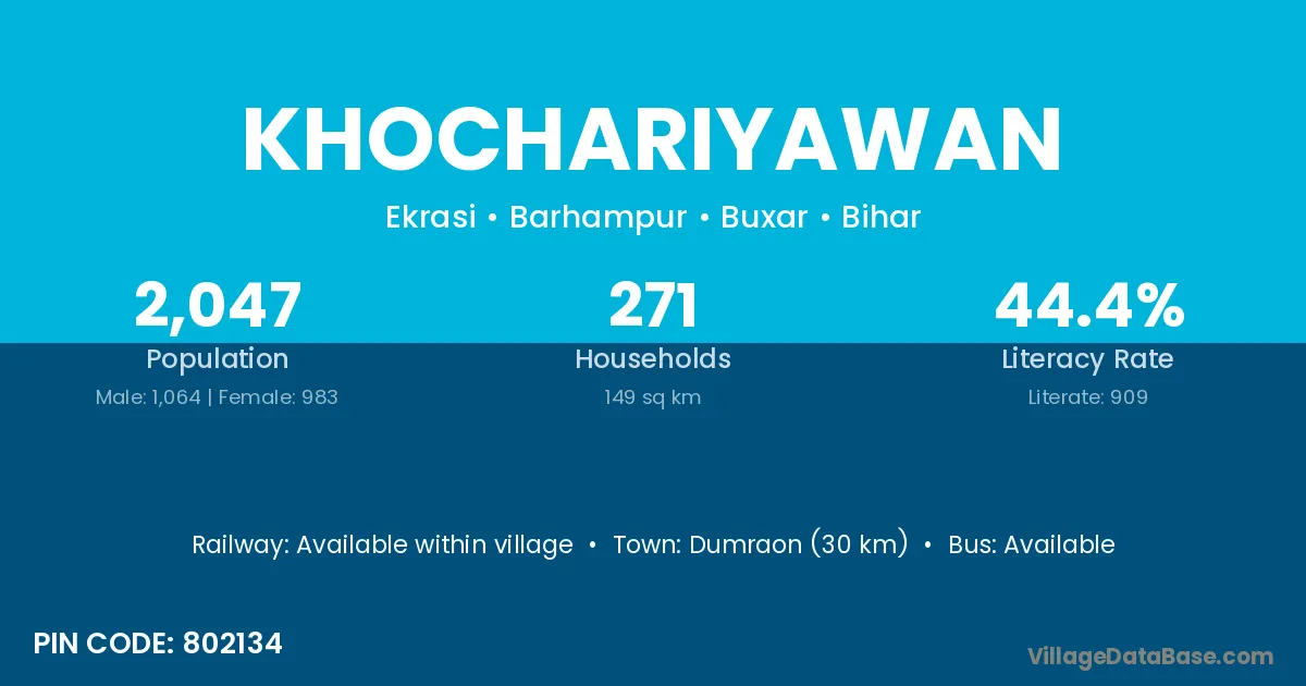 Dumraon (30 km) is the nearest town to Khochariyawan village for major economic activities and is located approximately 30 km away.