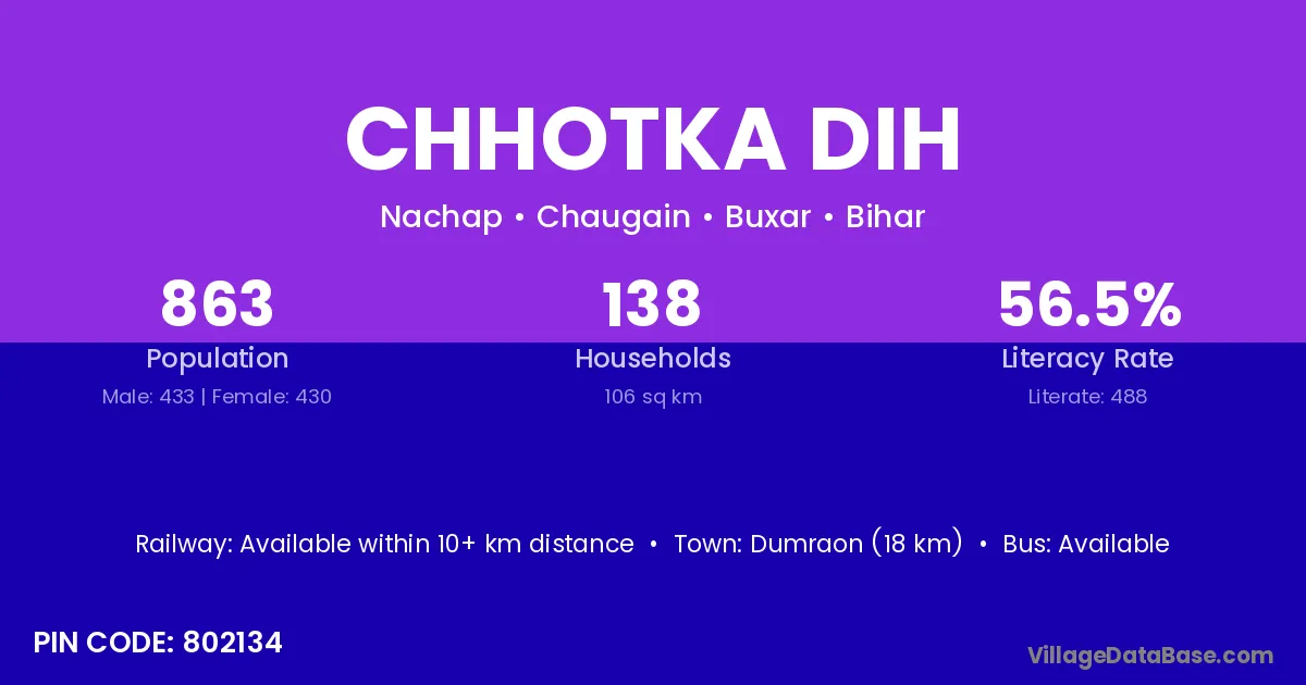 Dumraon (18 km) is the nearest town to Chhotka Dih village for major economic activities and is located approximately 18 km away.