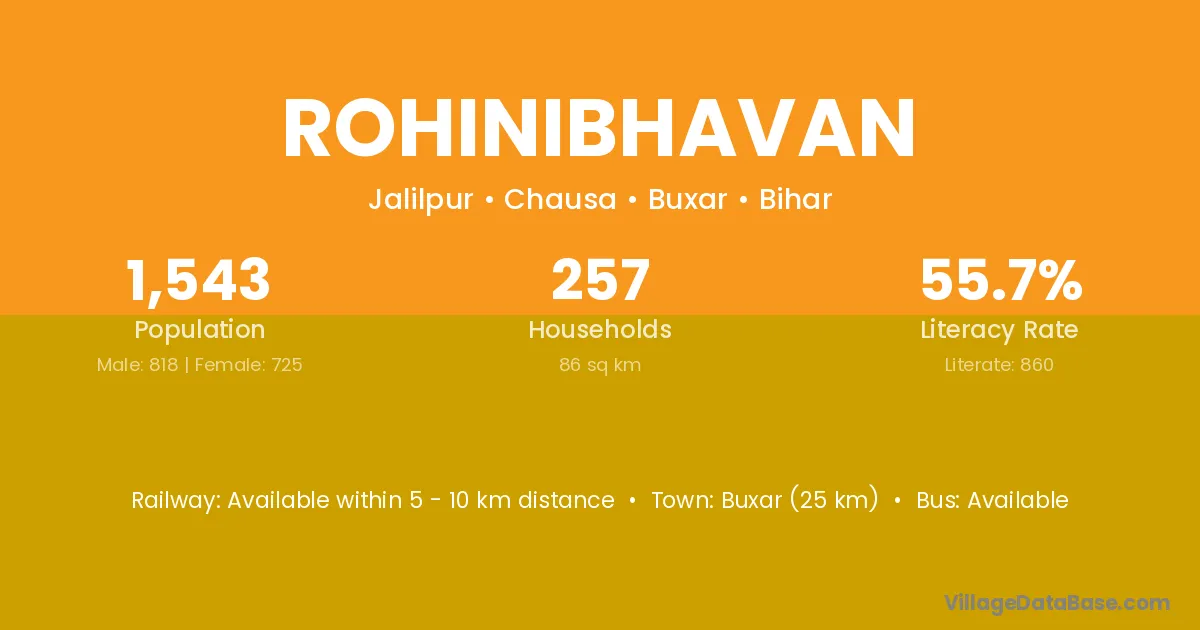 Buxar (25 km) is the nearest town to Rohinibhavan village for major economic activities and is located approximately 25 km away.