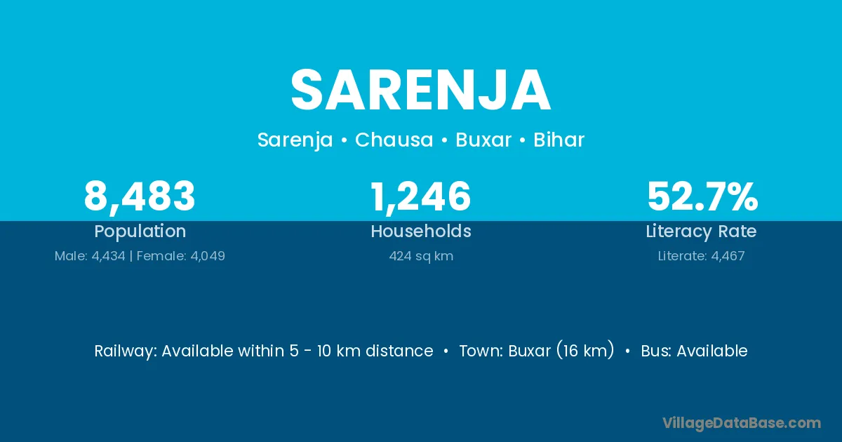 Buxar (16 km) is the nearest town to Sarenja village for major economic activities and is located approximately 16 km away.