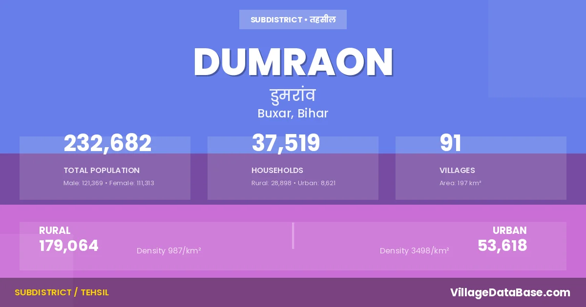 According to the 2011 census The total area of Dumraon Subdivision is 197 km², with a population of 232682 people. The population density is 1,183 inhabitants per square kilometre, and there are approximately 37519 houses in the sub district.