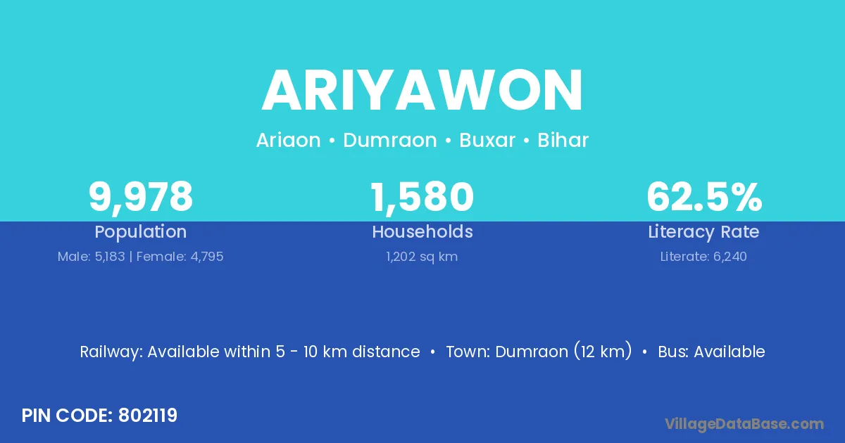 Dumraon (12 km) is the nearest town to Ariyawon village for major economic activities and is located approximately 12 km away.
