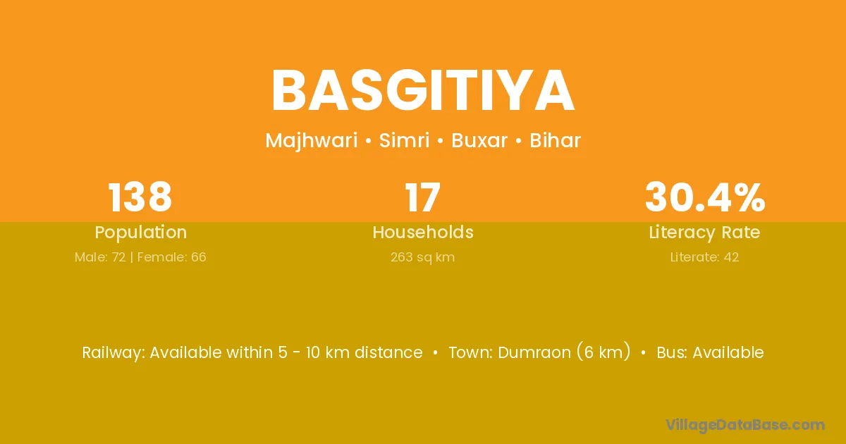 Dumraon (18 km) is the nearest town to Basgitiya village for major economic activities and is located approximately 18 km away.