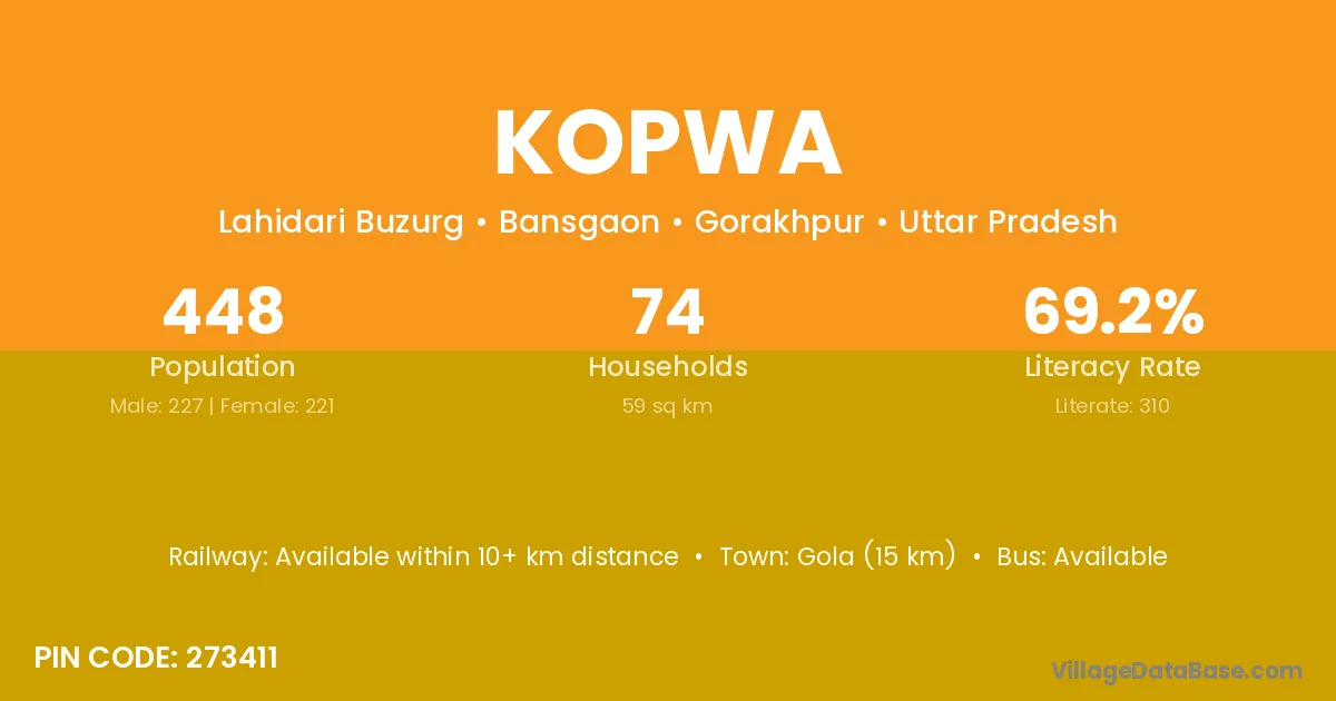The literacy rate of Kopwa village is 59.27%. Male literacy stands at 68.95% and female literacy at 48.52%.