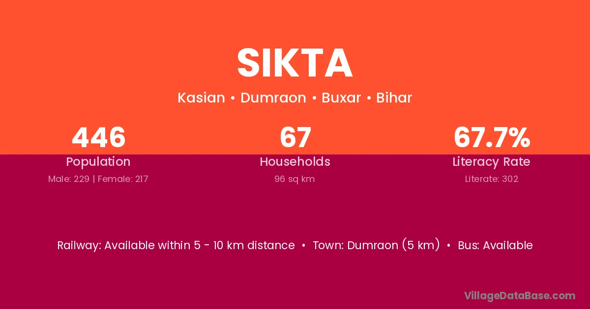 Sikta village has a total population of 446 people, of which 229 are males and 217 are females.