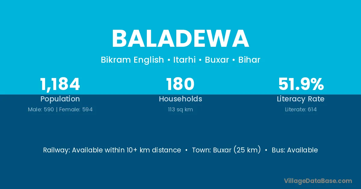 Buxar (25 km) is the nearest town to Baladewa village for major economic activities and is located approximately 25 km away.