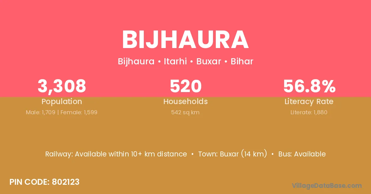 Buxar (14 km) is the nearest town to Bijhaura village for major economic activities and is located approximately 14 km away.
