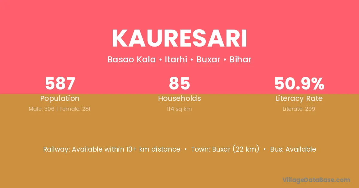 Buxar (22 km) is the nearest town to Kauresari village for major economic activities and is located approximately 22 km away.