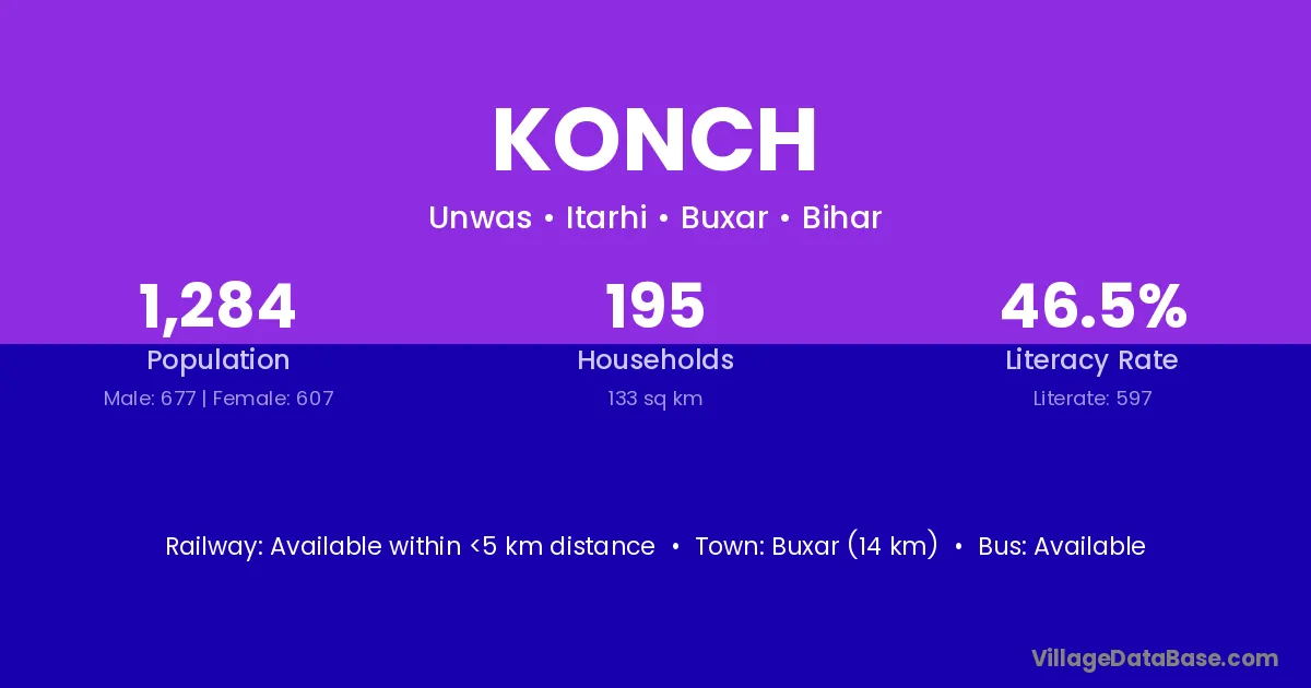 Buxar (14 km) is the nearest town to Konch village for major economic activities and is located approximately 14 km away.