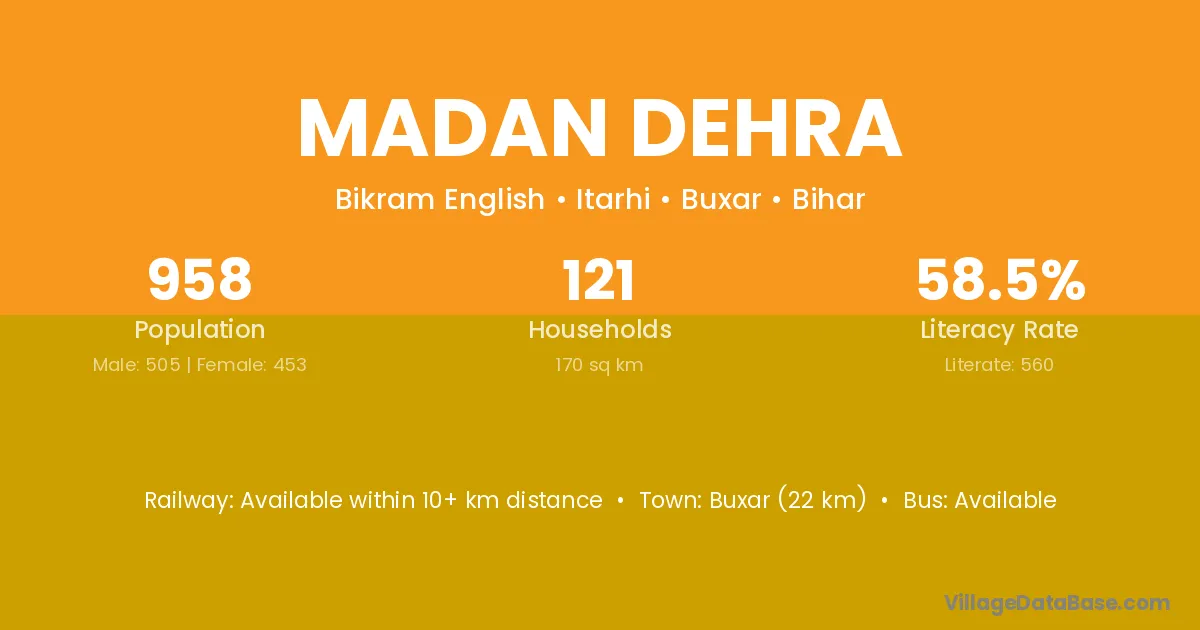 Buxar (22 km) is the nearest town to Madan Dehra village for major economic activities and is located approximately 22 km away.
