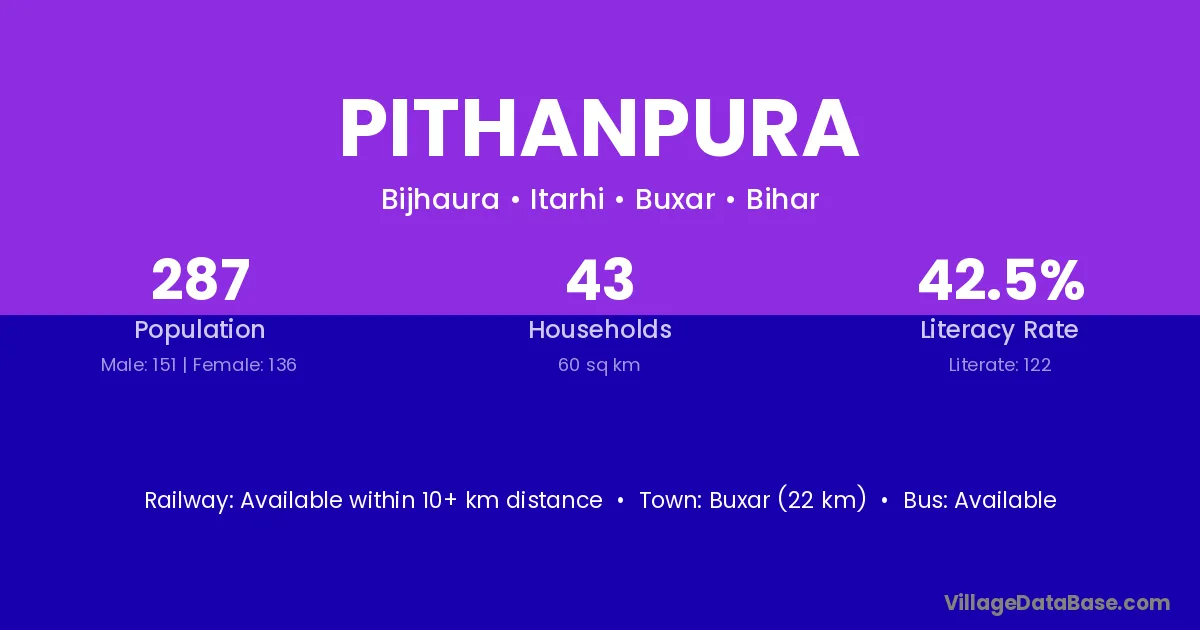 Buxar (22 km) is the nearest town to Pithanpura village for major economic activities and is located approximately 22 km away.
