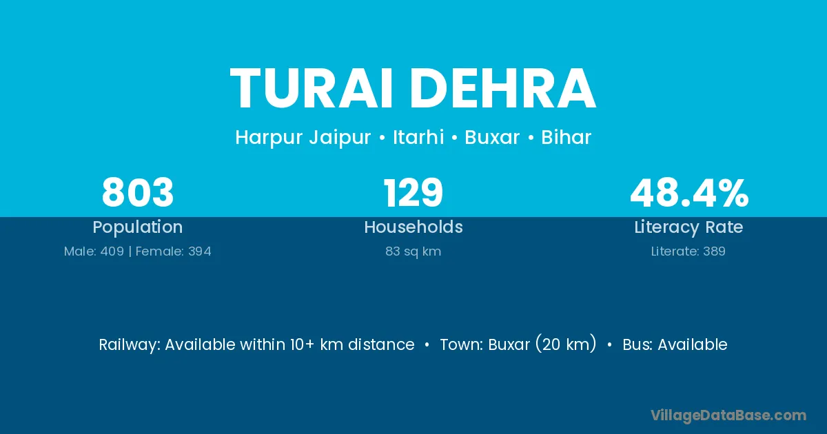 Buxar (20 km) is the nearest town to Turai Dehra village for major economic activities and is located approximately 20 km away.