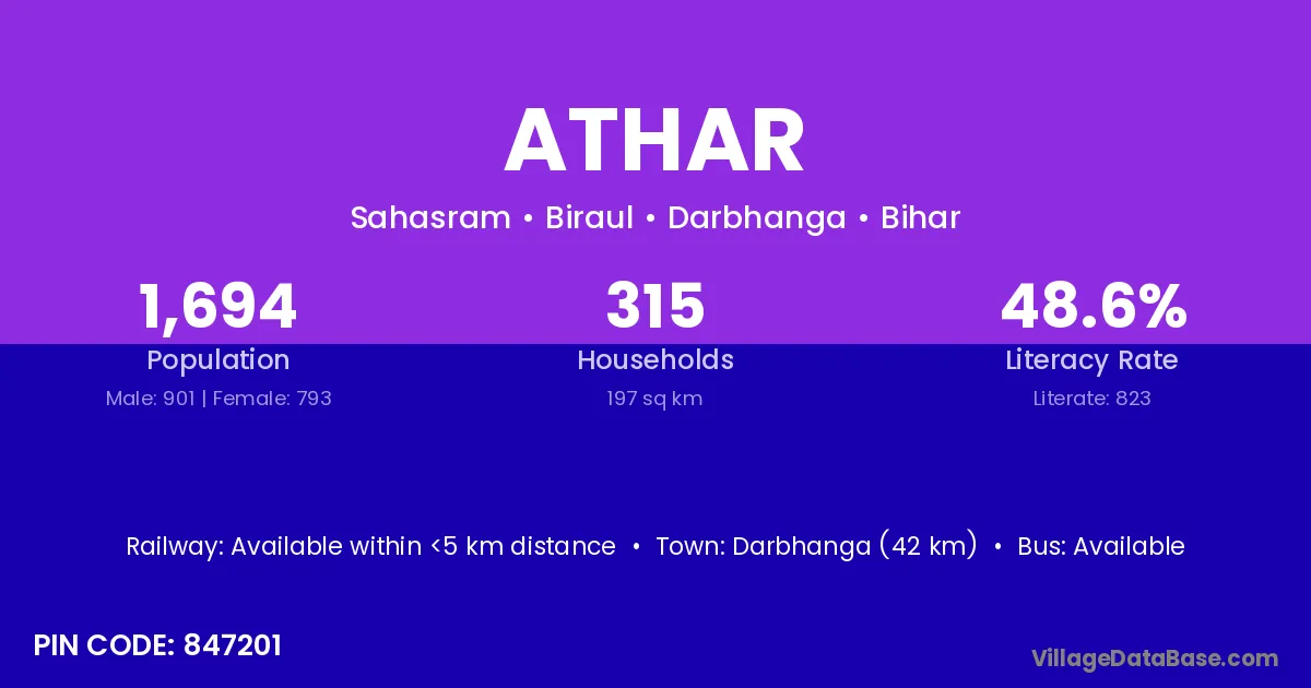The literacy rate of Athar village is 41.87%. Male literacy stands at 50.32% and female literacy at 32.67%.