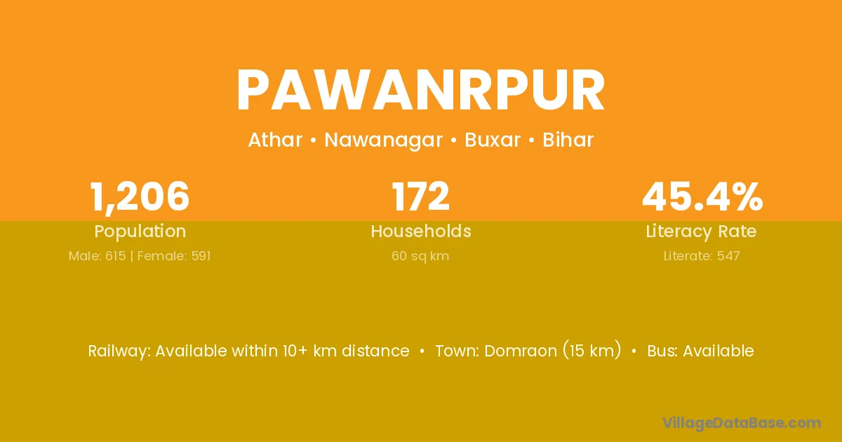 Domraon (15 km) is the nearest town to Pawanrpur village for major economic activities and is located approximately 15 km away.