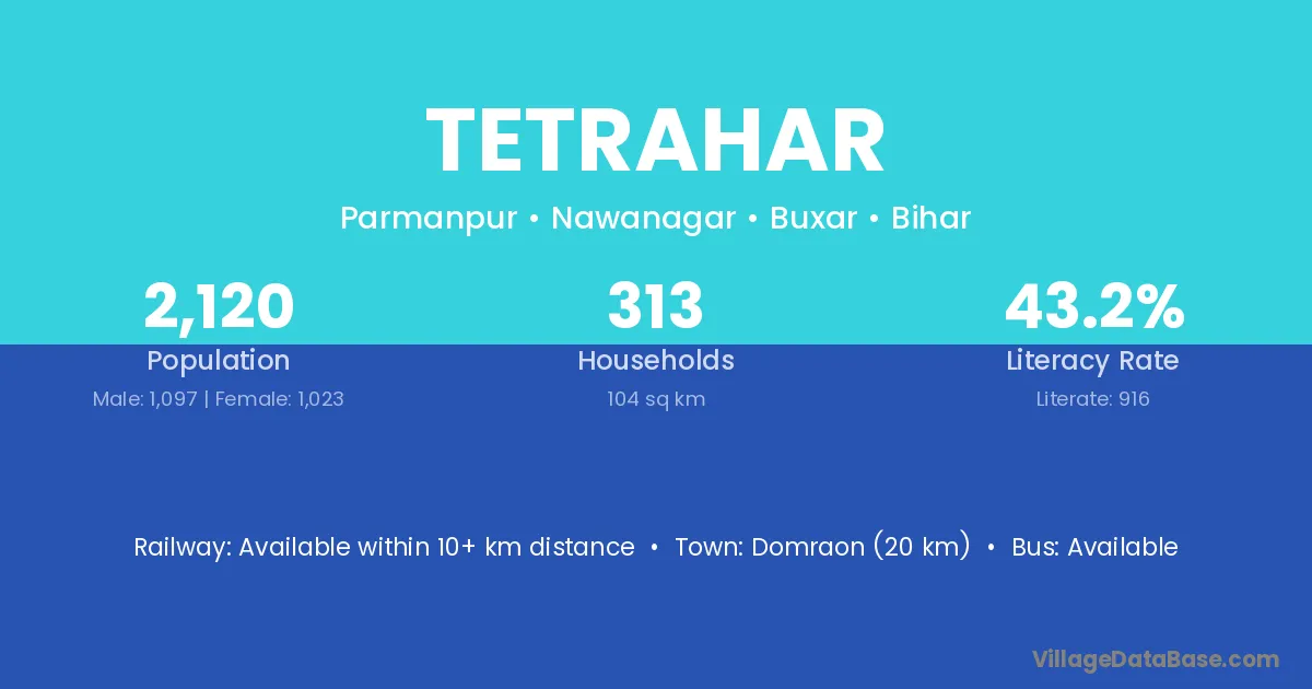 Domraon (20 km) is the nearest town to Tetrahar village for major economic activities and is located approximately 20 km away.