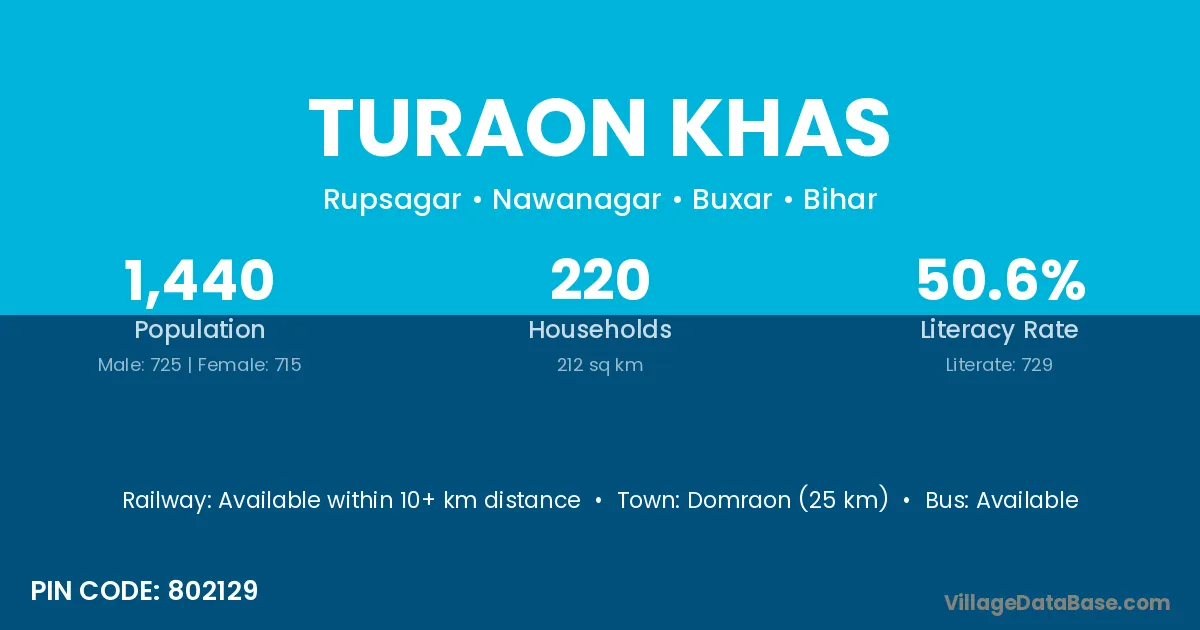 Domraon (25 km) is the nearest town to Turaon Khas village for major economic activities and is located approximately 25 km away.