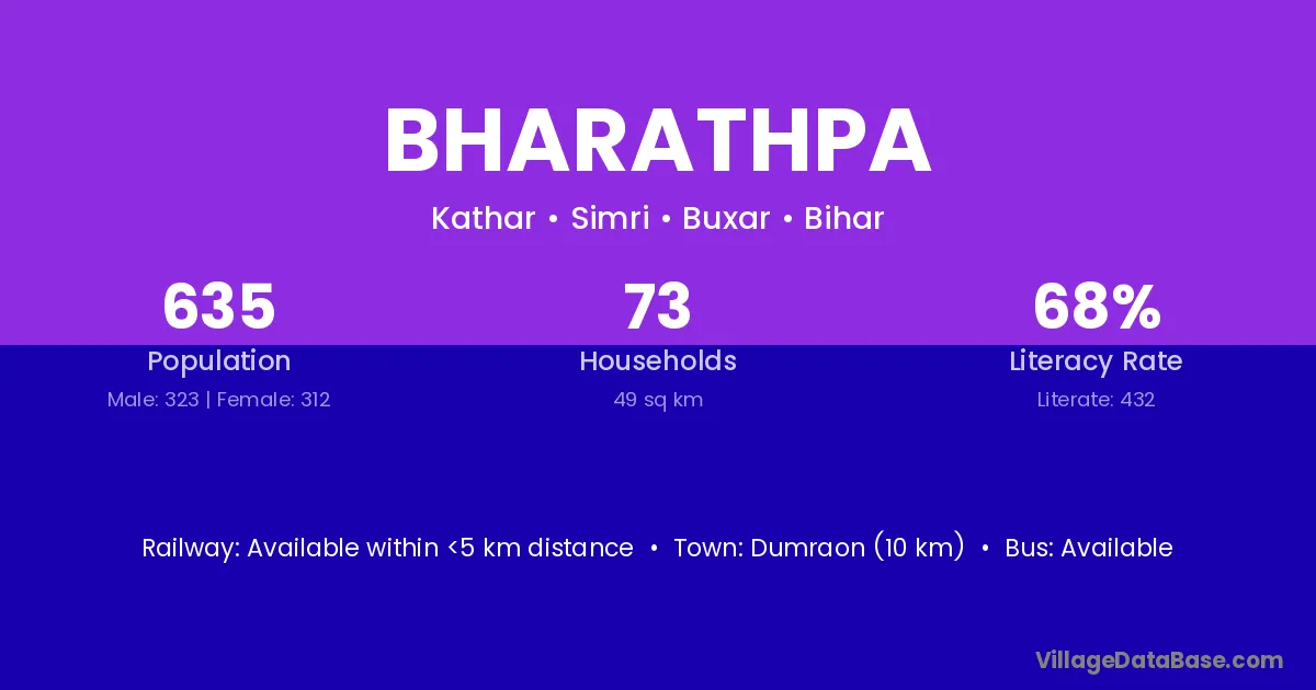 Dumraon (10 km) is the nearest town to Bharathpa village for major economic activities and is located approximately 10 km away.