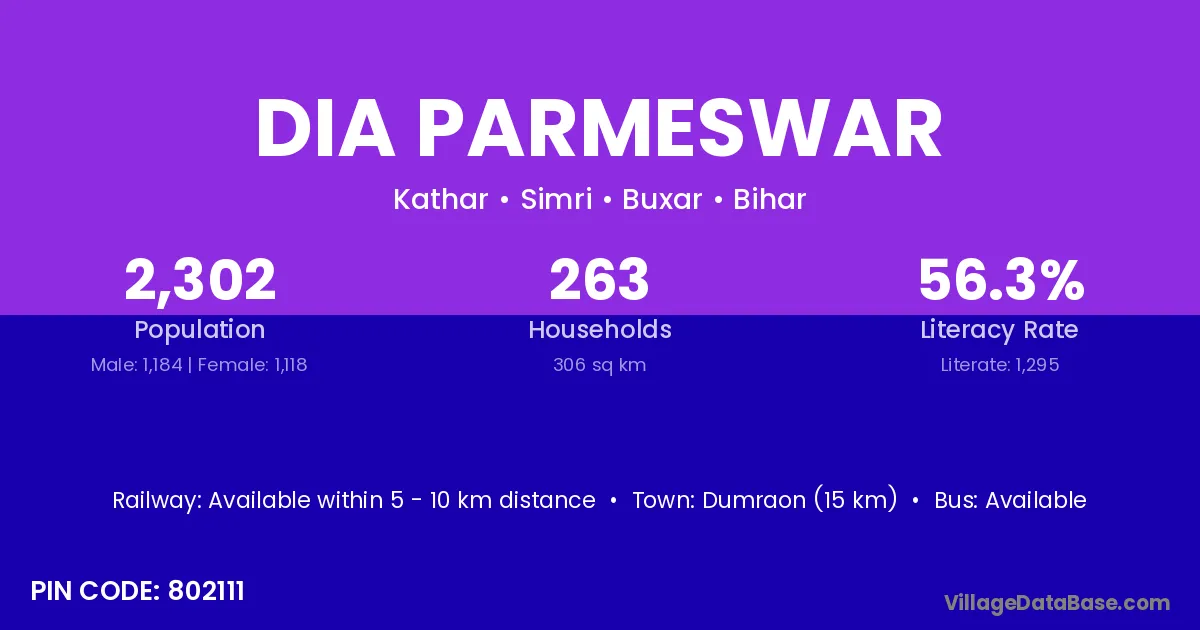 Dumraon (15 km) is the nearest town to Dia Parmeswar village for major economic activities and is located approximately 15 km away.