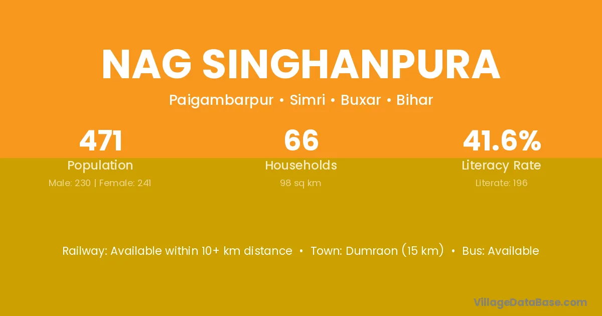 Dumraon (15 km) is the nearest town to Nag Singhanpura village for major economic activities and is located approximately 15 km away.