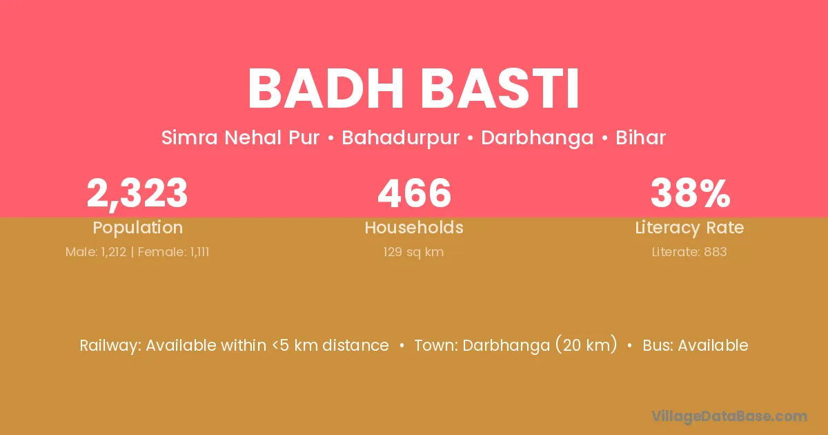 Darbhanga (20 km) is the nearest town to Badh Basti village for major economic activities and is located approximately 20 km away.