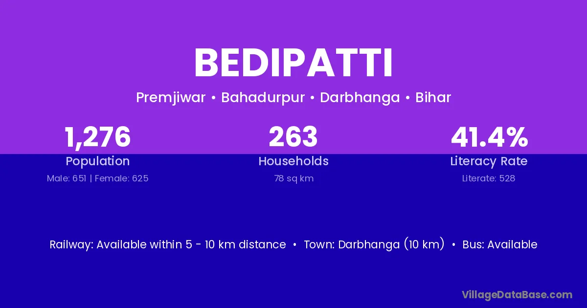 Darbhanga (10 km) is the nearest town to Bedipatti village for major economic activities and is located approximately 10 km away.