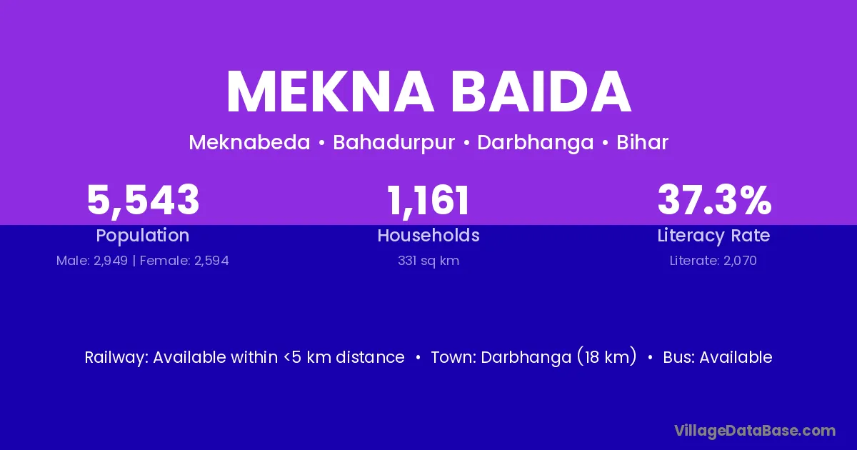 Darbhanga (18 km) is the nearest town to Mekna Baida village for major economic activities and is located approximately 18 km away.