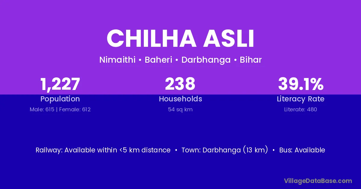 Darbhanga (13 km) is the nearest town to Chilha Asli village for major economic activities and is located approximately 13 km away.