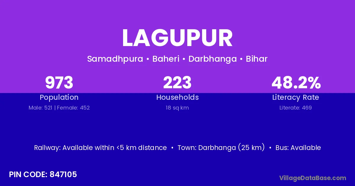 Darbhanga (25 km) is the nearest town to Lagupur village for major economic activities and is located approximately 25 km away.