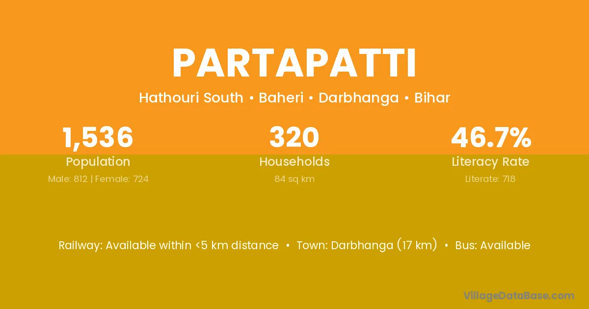 Darbhanga (17 km) is the nearest town to Partapatti village for major economic activities and is located approximately 17 km away.