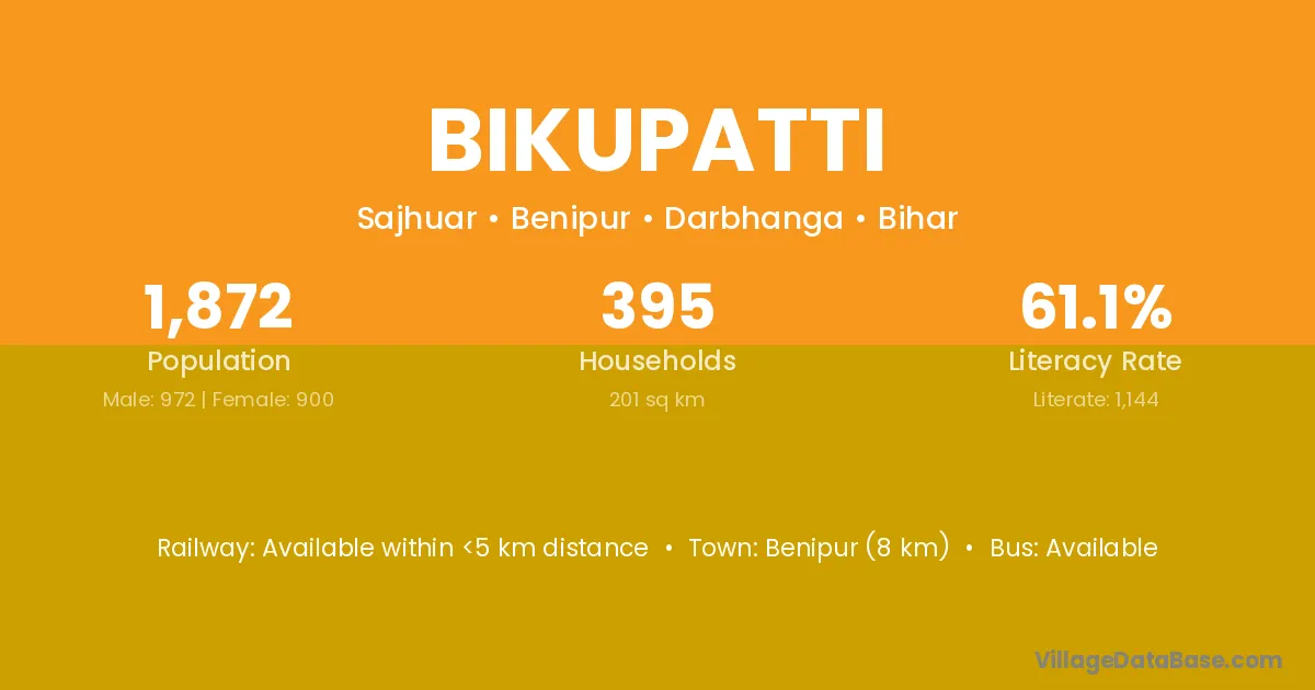 Benipur (8 km) is the nearest town to Bikupatti village for major economic activities and is located approximately 8 km away.