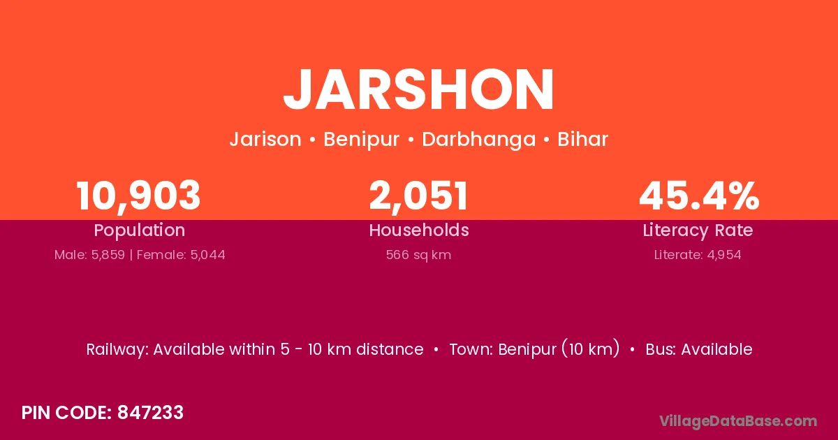 Benipur (10 km) is the nearest town to Jarshon village for major economic activities and is located approximately 10 km away.
