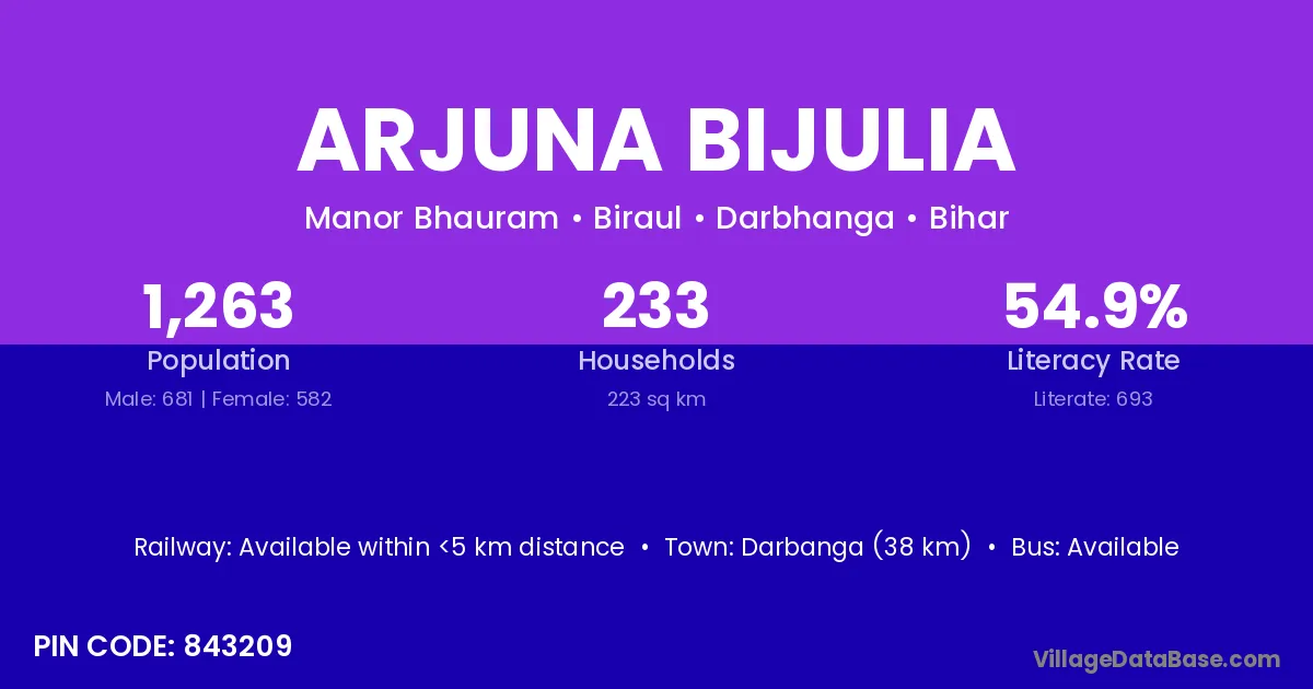 Darbanga (38 km) is the nearest town to Arjuna Bijulia village for major economic activities and is located approximately 38 km away.