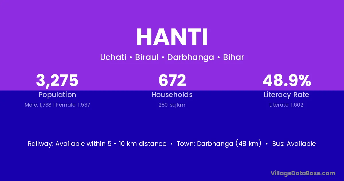 Darbhanga (48 km) is the nearest town to Hanti village for major economic activities and is located approximately 48 km away.