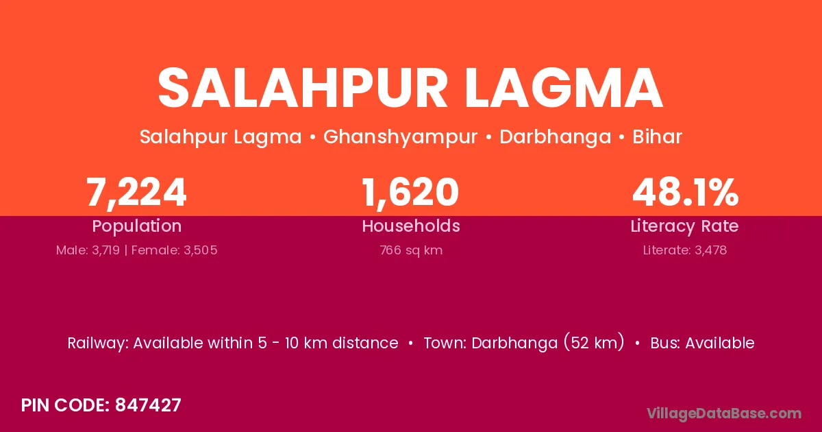 Darbhanga (52 km) is the nearest town to Salahpur Lagma village for major economic activities and is located approximately 52 km away.