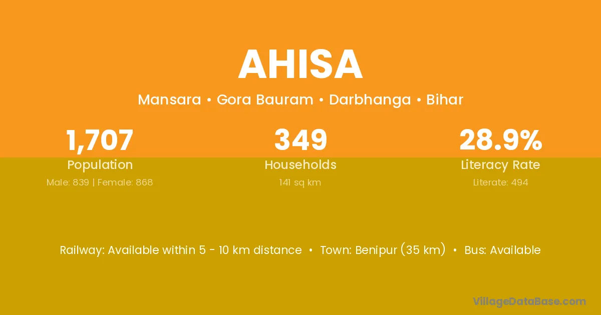 Benipur (35 km) is the nearest town to Ahisa village for major economic activities and is located approximately 35 km away.