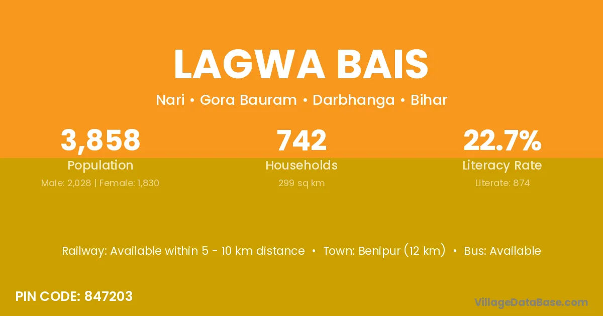 Benipur (12 km) is the nearest town to Lagwa Bais village for major economic activities and is located approximately 12 km away.