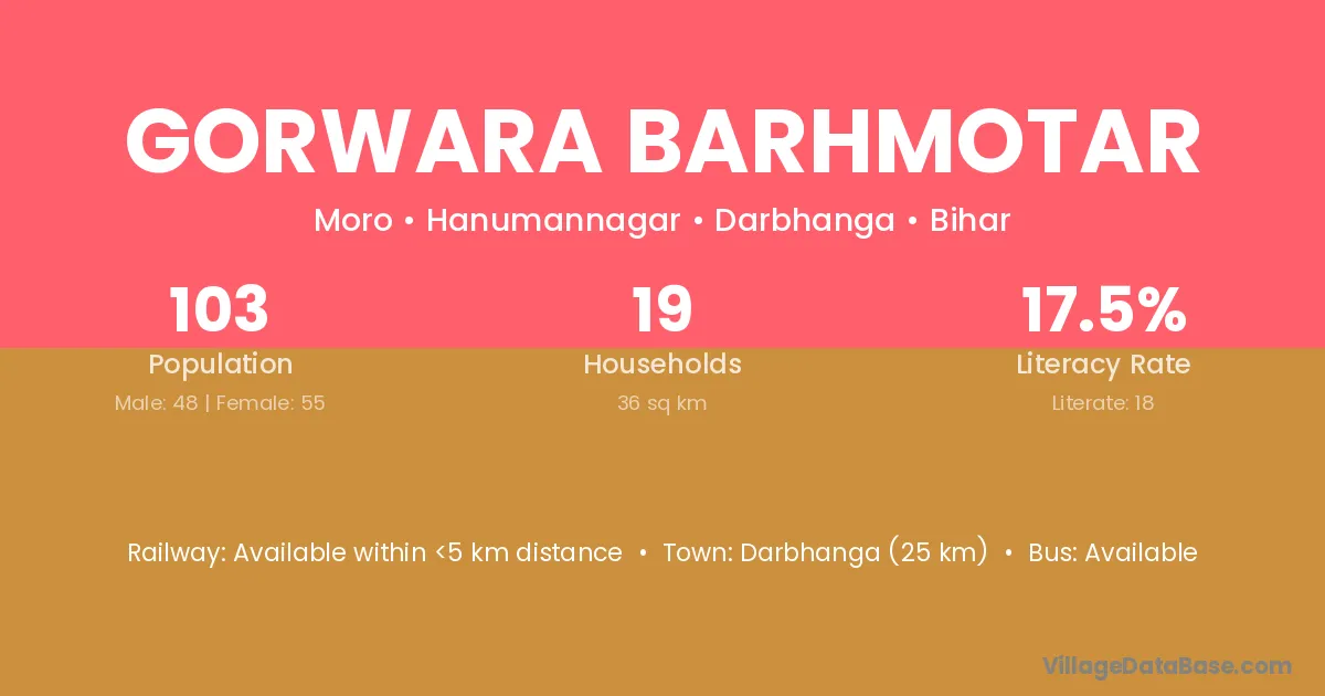Darbhanga (25 km) is the nearest town to Gorwara Barhmotar village for major economic activities and is located approximately 25 km away.